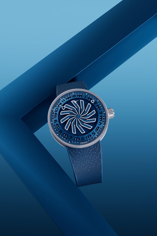 The ever-evolving timepiece with stainless steel case and blue plated bezel seamlessly integrates with the unique turbine dial.