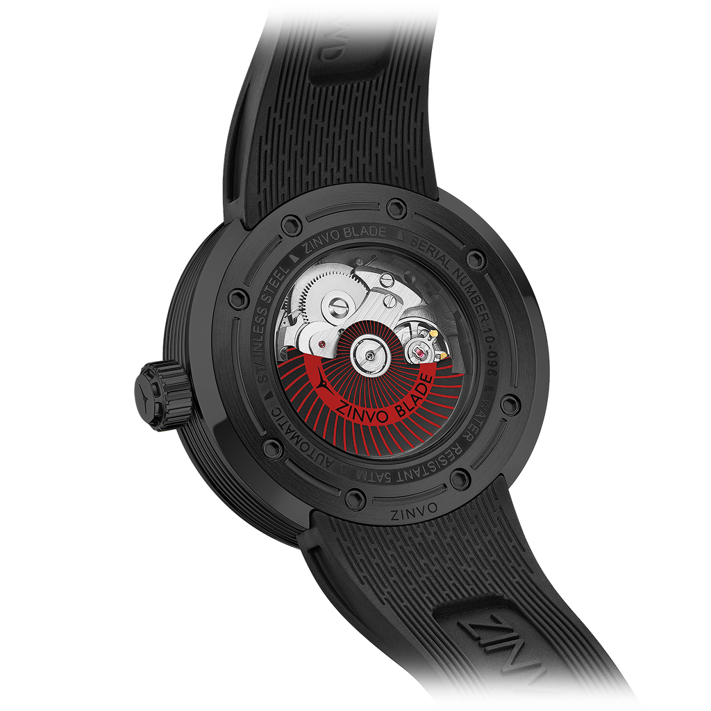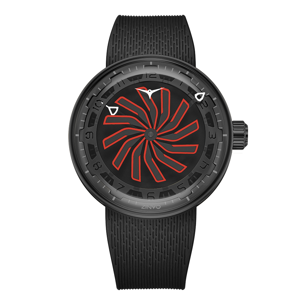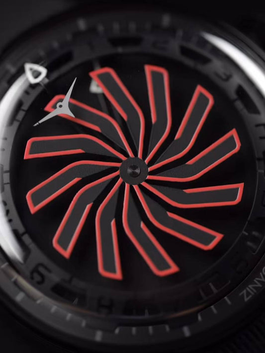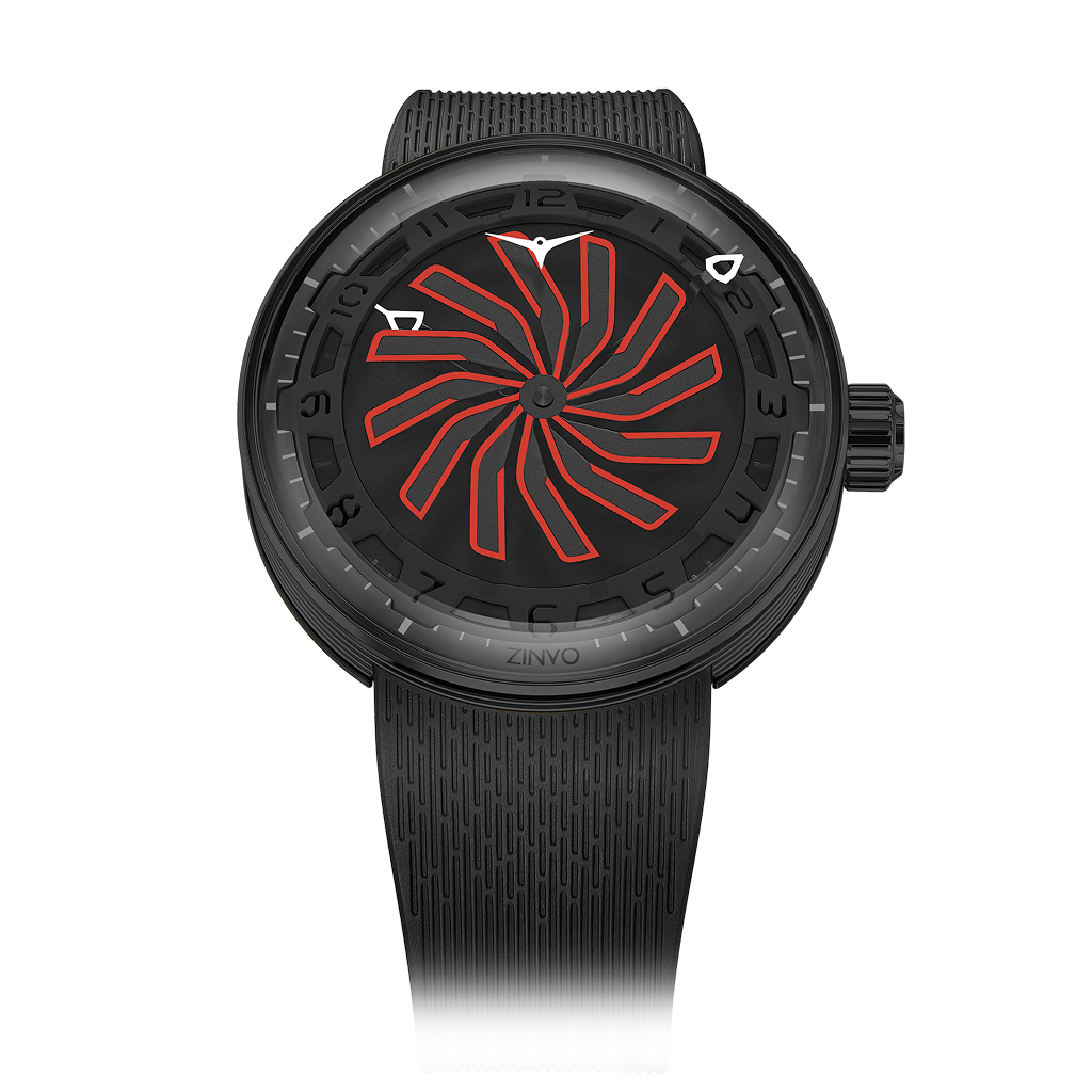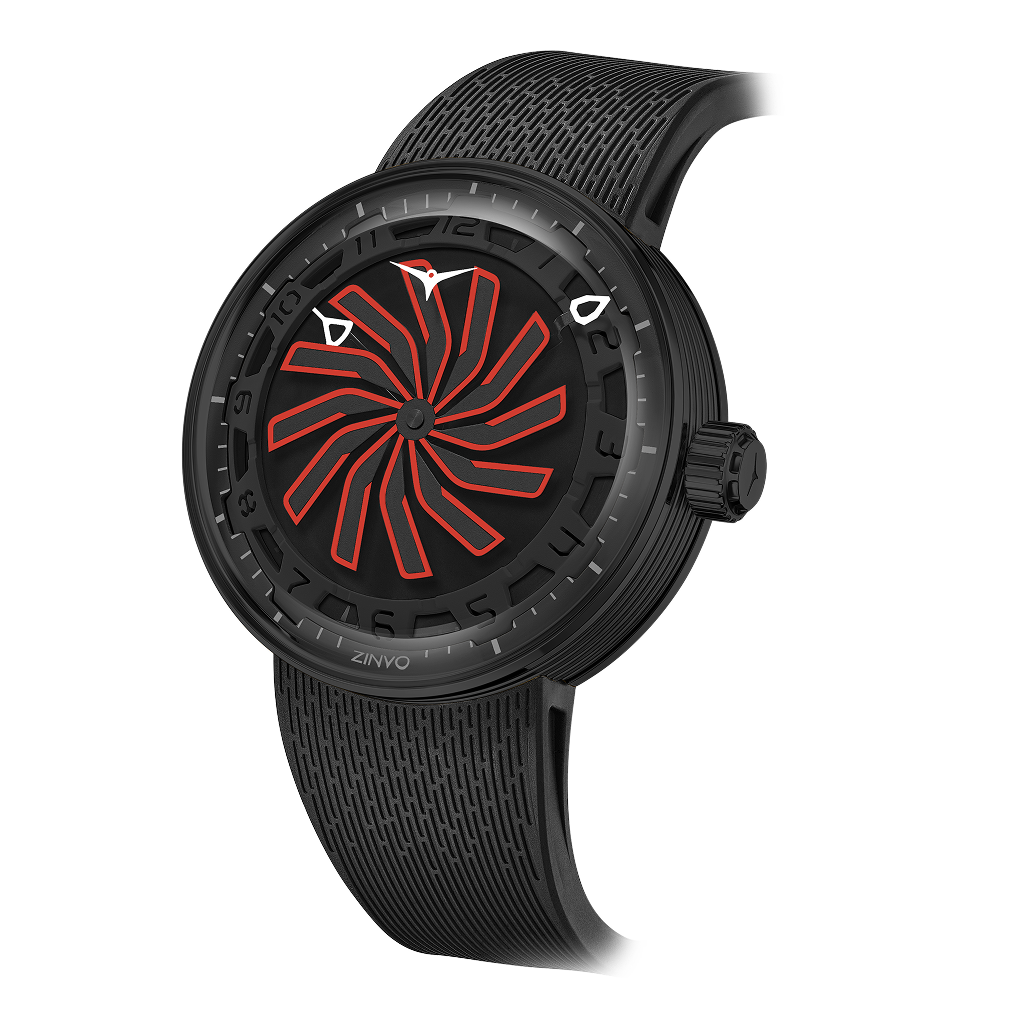 Featuring a matte black 316L stainless steel case and a red color combination, along with ZINVO's unique 1-second-spin turbine dial, this watch is powered by an automatic movement.
