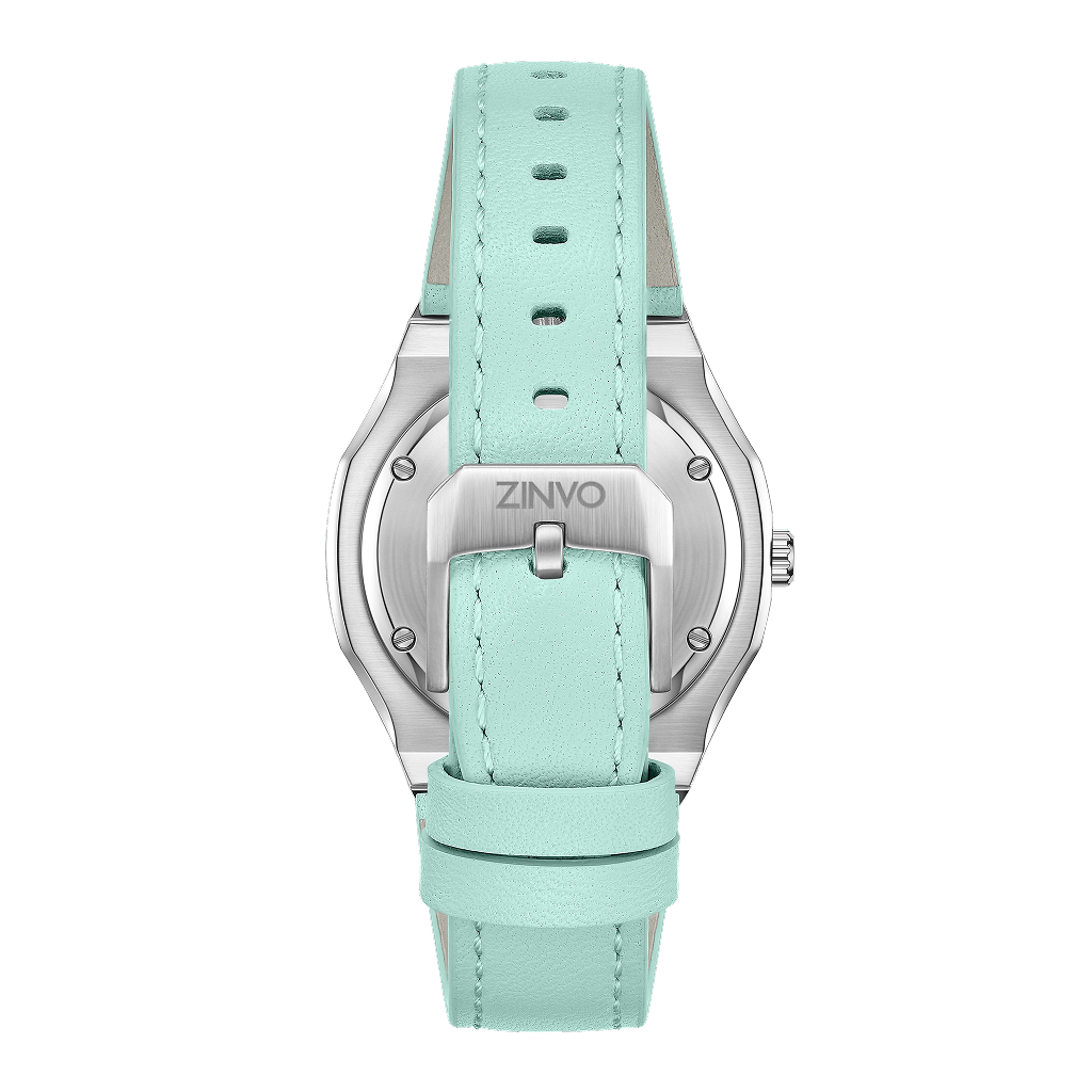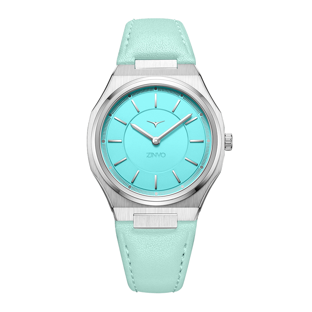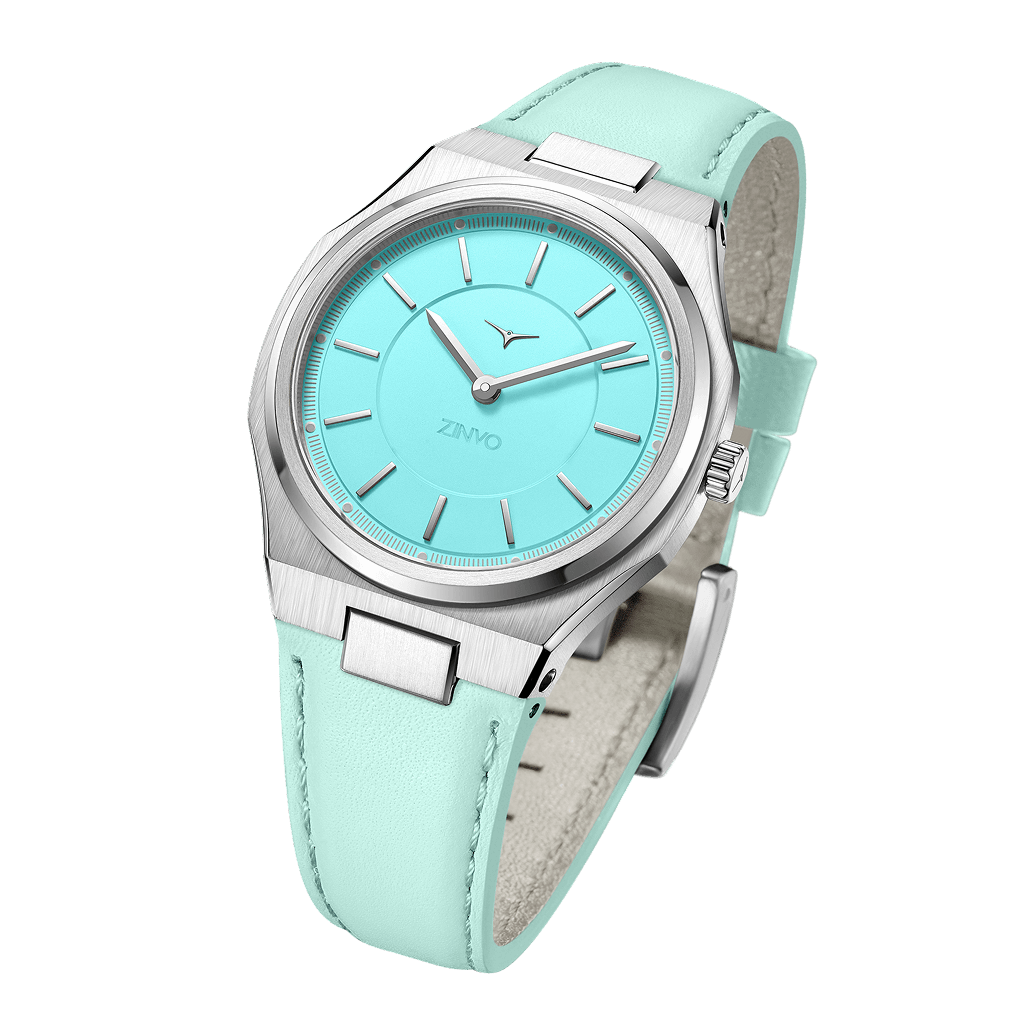 Radiating calm and confidence, this women’s timepiece pairs a sleek silver case with an aquamarine dial and strap — designed to brighten your look with understated charm.